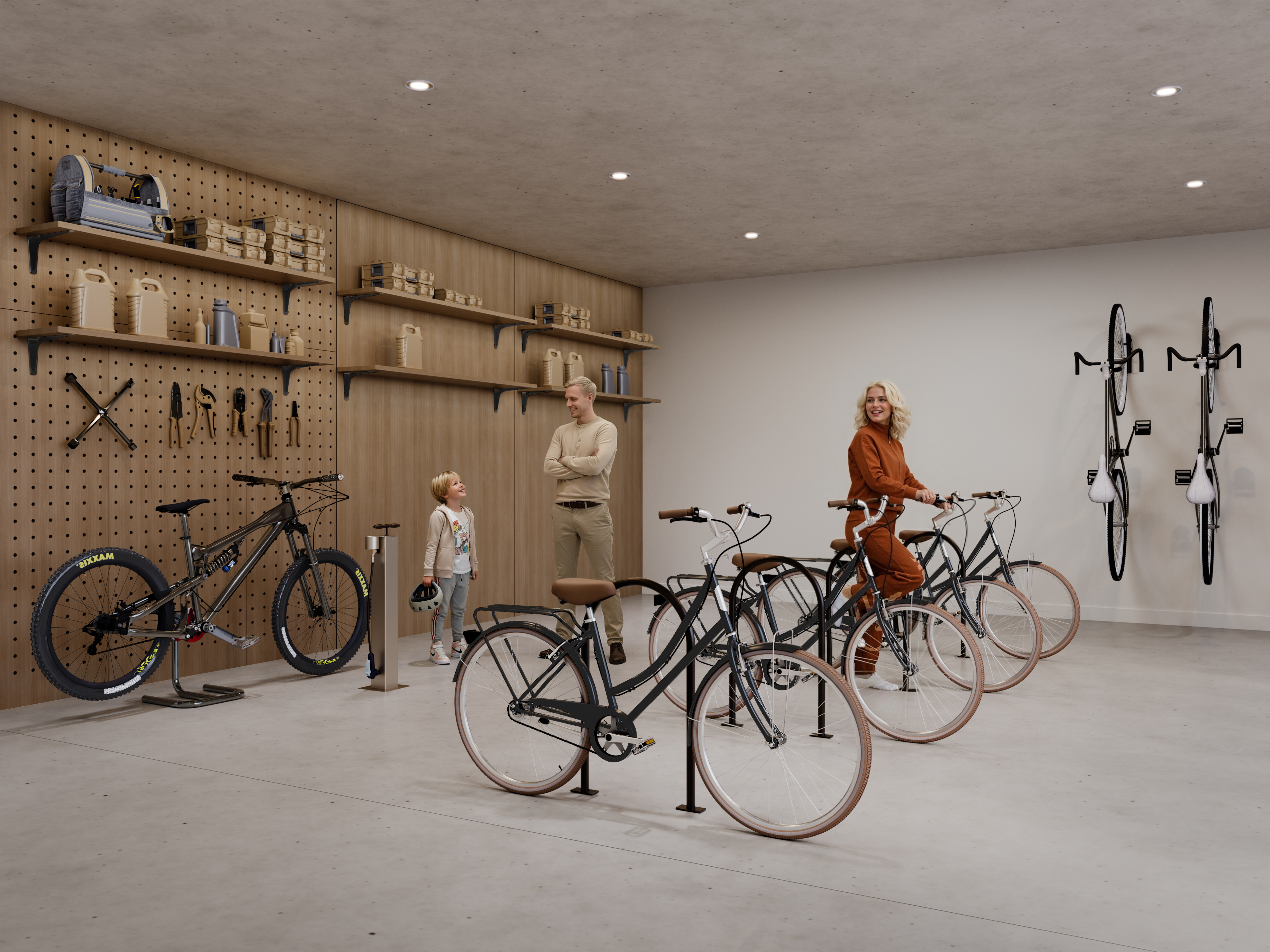Kartais mažiausios detalės daro didžiausią skirtumą. Čia kiekvienam butui dovanų priklauso atskira dviračių saugykla – patogi, saugi ir visada po ranka. Joje lengvai sutalpinsite ne tik dviračius, bet ir sezoninius daiktus, kad namuose liktų daugiau erdvės gyventi.
