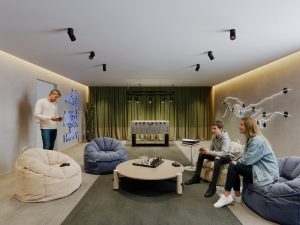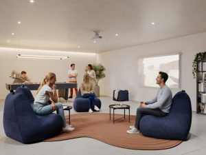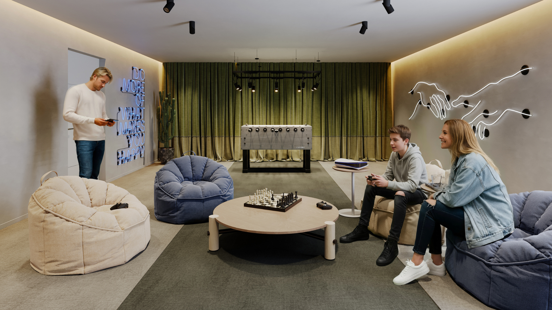 Susitikite pokalbiams, žaidimams ir mažoms pergalėms. Sėdmaišiai, projektorius, biliardas ir stalo žaidimai kuria vietą, kur kaimynai iš pažįstamų tampa savais.